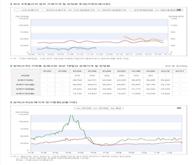 출하동향/작황상태: 고구마 작황 상태는 파종시 우천과 수확시 가뭄으로 인해 출하시기가 평년대비 일주일 가량 늦어진 상황이며 수확량도 감소한 상황임 |